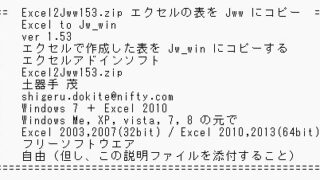 ============== Excel2Jww153.zip エクセルの表を Jww にコピー =============【ソ フ ト名】 Excel to Jw_win【バージョン】 ver 1.53【機 能】 エクセルで作成した表を Jw_win にコピーする エクセルアドインソフト【登 録 名】 Excel2Jww153.zip【著作権 者】 土器手 茂【作者連絡先】 shigeru.dokite@nifty.com【開発 環境】 Windows 7 + Excel 2010【動作 環境】 Windows Me, XP, vista, 7, 8 の元で Ex...続きを読む
