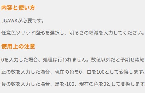 ソリッド明るさ変更 2026.01.20 概要 Unosuke Online Unosuke Online 任意色ソリッド図形を選択し、明るさの増減を入力してください。 詳細内容を見る この外部変形を利用するには、「JGAWK」が必要です。