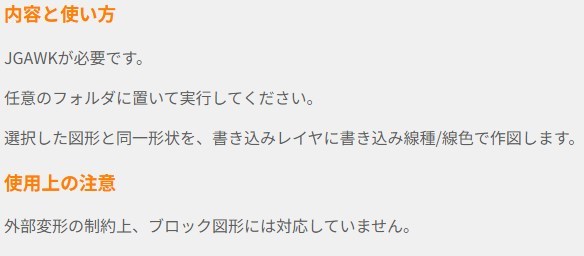 幅0で複線 2026.01.20 概要 Unosuke Online Unosuke Online 選択した図形と同一形状を、書き込みレイヤに書き込み線種/線色で作図します。 詳細内容を見る この外部変形を利用するには、「JGAWK」が必要です。