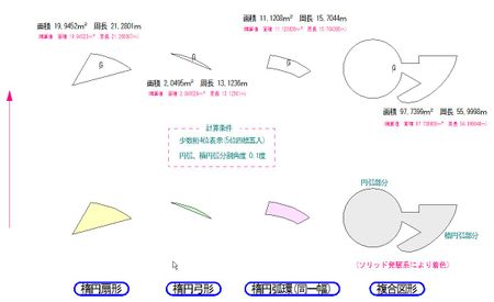 - 円弧、楕円弧部分は直線近似で計算しますのである程度の誤差は生じます。