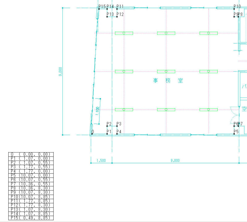 座標を算出したい複数の点を指示し、測点名と座標リストを作成する。電気工事の仕事をしている知人からの依頼で、部屋の照度計算ソフトでは、変則の部屋の形では座標による入力になるので、これをやりやすくしたいとのことで作ったものです。