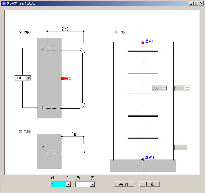 このアプリケーションは、RC打込み用のタラップの平面図、断面姿図(正面、側面)を描きます。