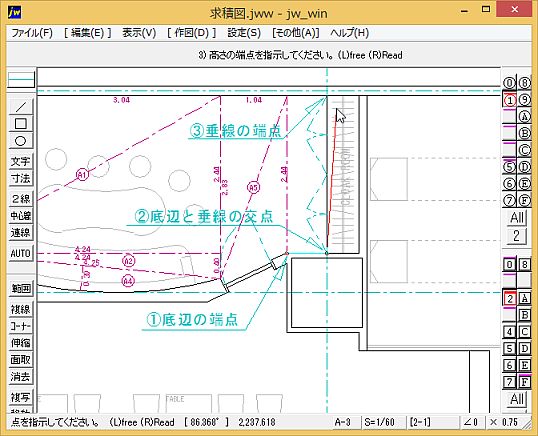- 計算表は、Jw_cad の目盛読取と揃えることで、計算根拠式などが読取り点にスナップし、作図後の修正が容易になります。