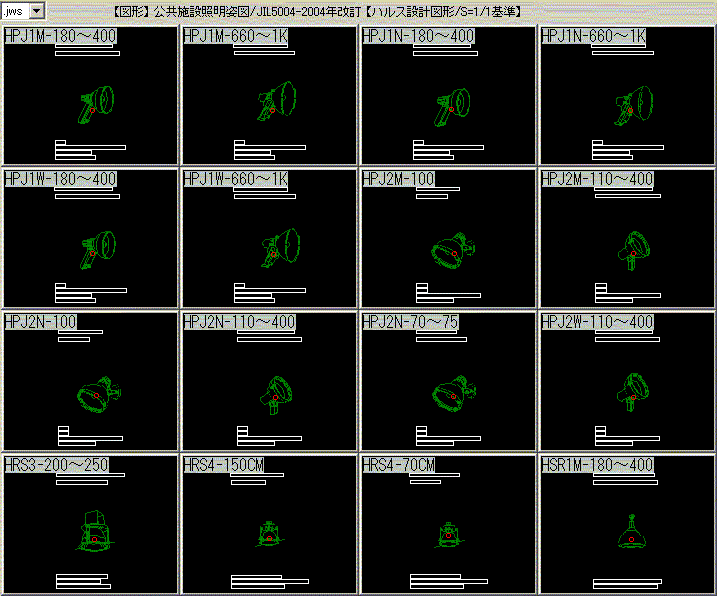 JIL照明・水銀灯姿図 2026.01.14 概要 ハルス設計 ハルス設計 公共施設照明器具JIL5004-2004年改訂版 水銀灯類照明姿図形 【23個】 詳細内容を見る 「.EXE」ファイルが展開(解凍)できない方はこちら 「.zipファイルのダウンロード」