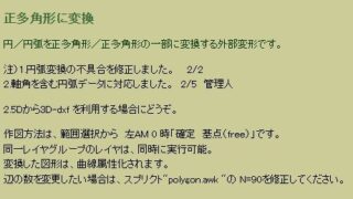 概要CAD_Dwg+α円/円弧を正多角形/正多角形の一部に変換する外部変形です。2.5Dから3D-dxf を利用する場合にどうぞ。作図方法は、範囲選択から 左AM 0 時「確定 基点(free)」です。同一レイヤグループのレイヤは、同時に実行可能。変換した図形は、曲線属性化されます。詳細内容を見る